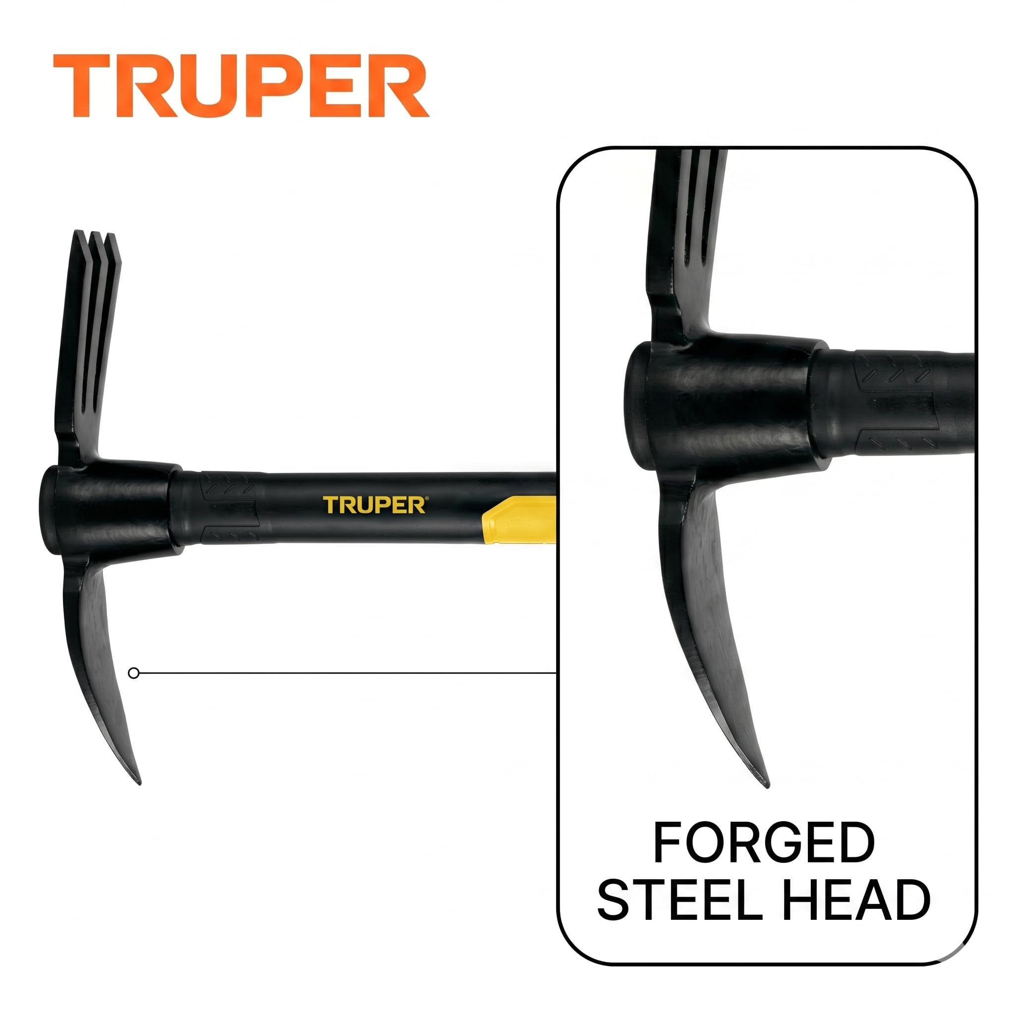 Truper Rapid Tiller, Digger Cultivator, 14-Inch Fiberglass Handle with Comfort Grip, Forged Steel Dual-Head Digging and Aerating Tool (Model RATI-F / 32739)