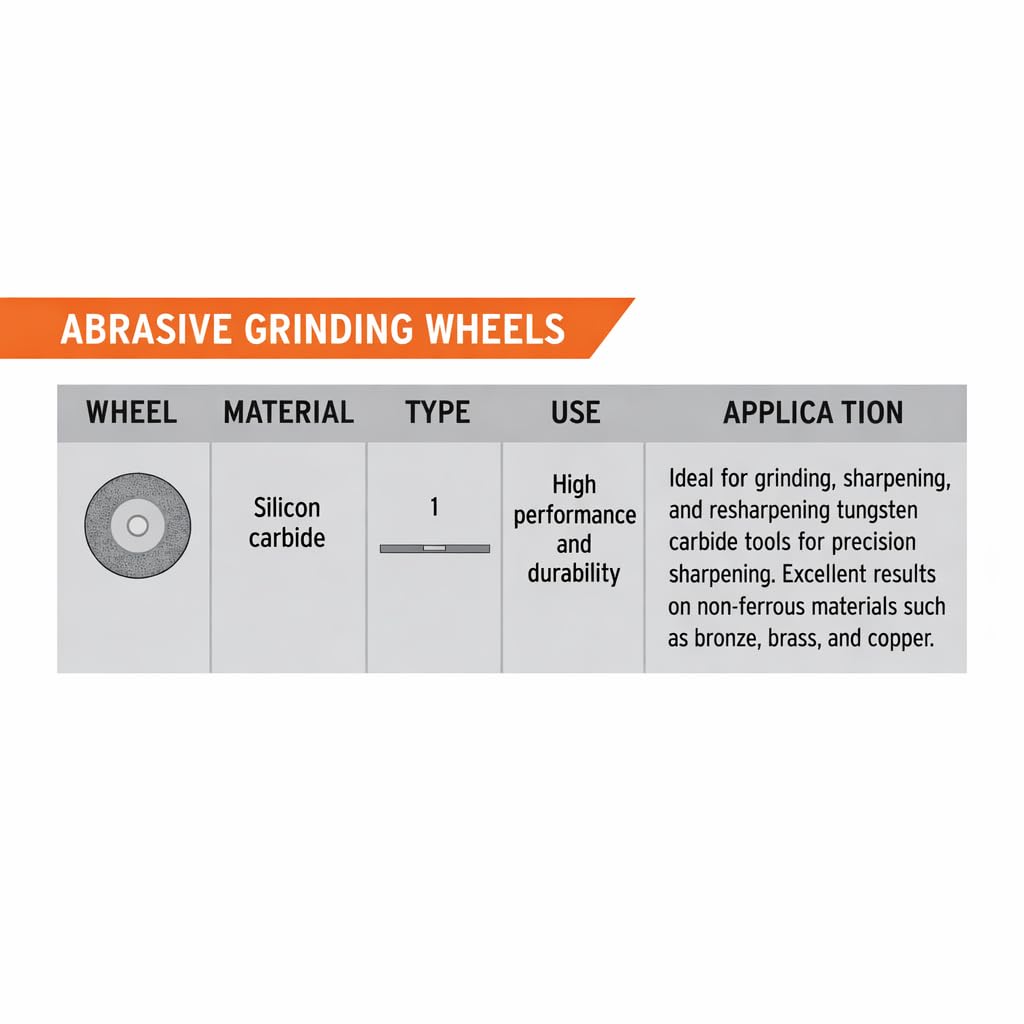 - SILICON CARBIDE ABRASIVE: Made from silicon carbide and specified for grinding and rectifying tungsten carbide tools, with use noted for non-ferrous materials like bronze, brass, and copper.